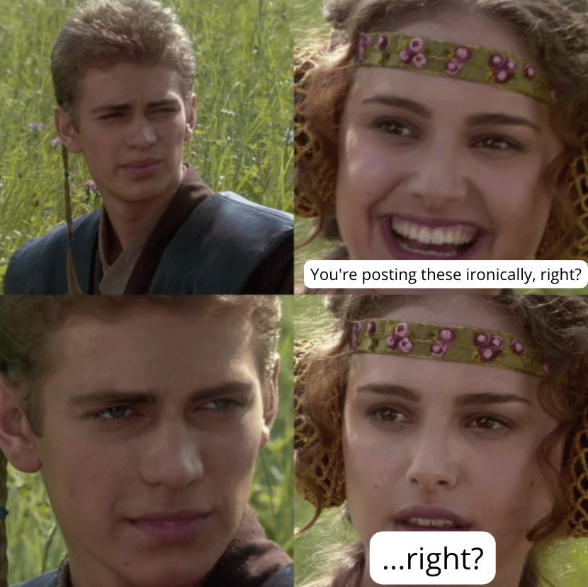 "I'm making fun of you for taking it seriously" When challenged, the response isn't defense but counter-mockery. "Imagine being triggered by a cartoon frog." The critic becomes target, accused of humorlessness, oversensitivity.